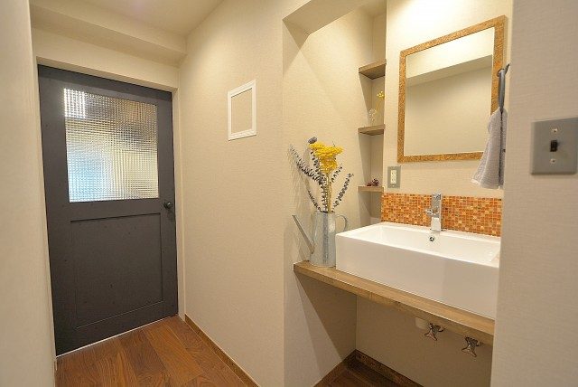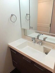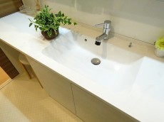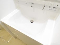 ドレッサーのようにイスが置ける大きめの洗面化粧台。カウンターも広々していて身支度もしやすそうです。2人並んで使える位の広さがあるので、朝から洗面台の取り合いでもめる、なんて心配はなくなるのではないでしょうか?