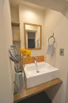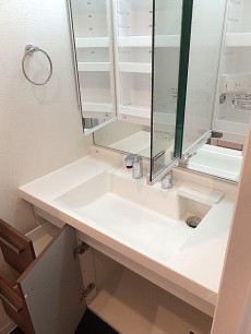洗面化粧台はスクエア型のスタイリッシュな作りになっています。