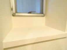 窓際は物が置けるくらいのカウンターになっているので、カゴやBOXにペーパーのストックなどを収納してここに置くといいかも・・・。