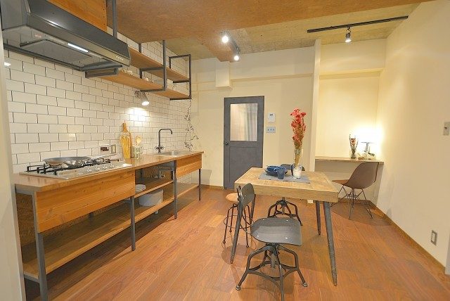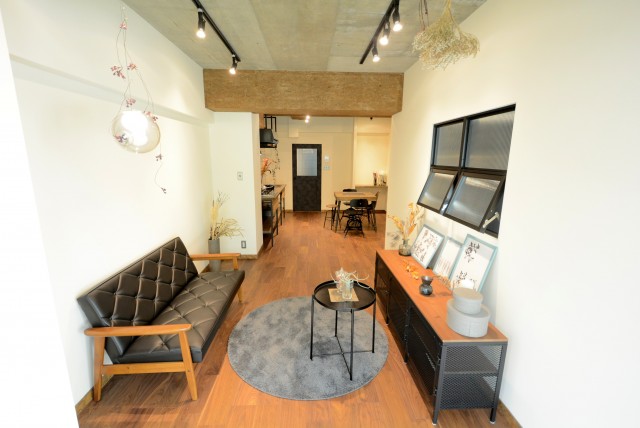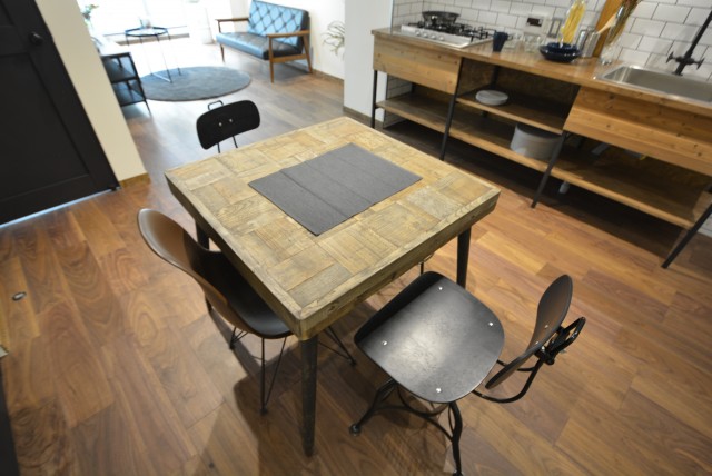 LDKは約10帖。ダイニングテーブルが置いてあるので、実際の広さや生活イメージもつきやすいのではないでしょうか?(室内の家具もついてきます。)