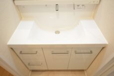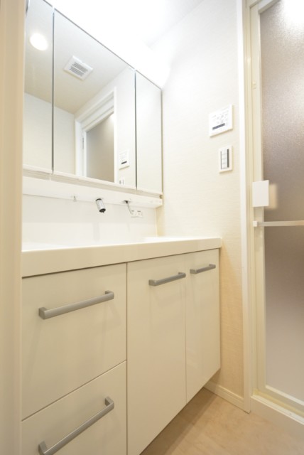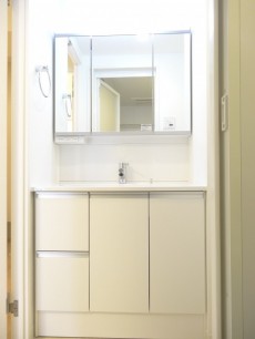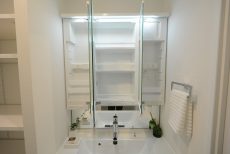 まずは三面鏡付きの洗面台。照明付きで鏡を使う時に影になる心配もありません。