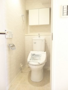 吊戸棚は縦長で、低い所にも収納出来て助かります。便器が邪魔で近づけず、高い所の物を取るのが意外と大変なんですよね^^;)もちろん温水洗浄便座付き。TOTO製のウォシュレットです。