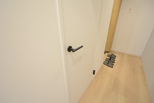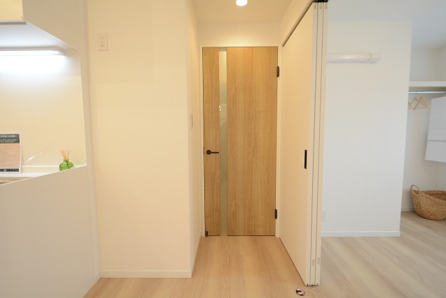 ドアを開けると正面は壁になっていて廊下は左側に伸びています。宅配便やフードデリバリーなどを受取る時に、お部屋の中が見えづらいのがいいですね。入口には人感センサーが設置されていて自動的に照明を点けてくれます。暗い中スイッチを探したりする事ももうありません。なにより、いつでも明るい玄関が迎えてくれるのが嬉しいですよね(^^)