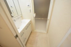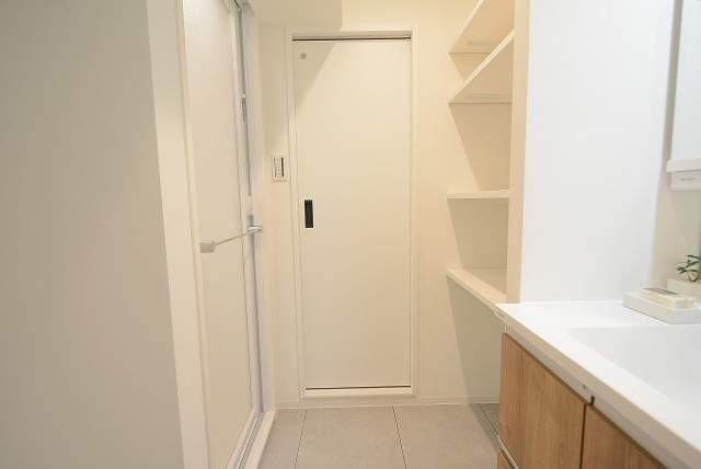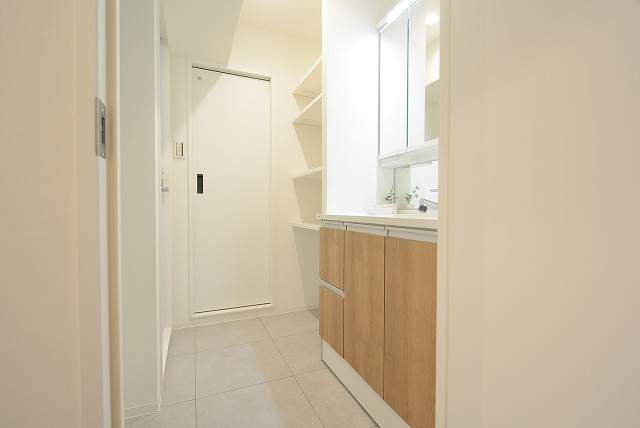 廊下へ戻ってきて、洗面室へ。左側に洗面化粧台、正面に収納棚、右側にバスルームのならびになっています。