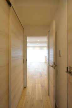 左に伸びる廊下は、木目の建具と白のクロスでナチュラルな雰囲気ですね。