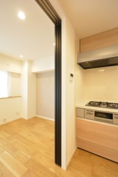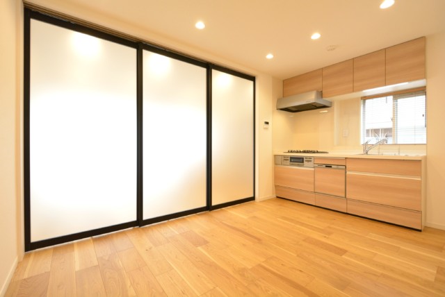 閉めた時のダイニングキッチン。扉が光を通すので閉めても暗くなる事もありません。柔らかい光でいい感じですね。