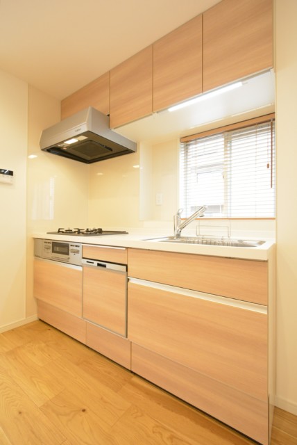 3口のグリル付きガスコンロ、浄水機能付きの水栓はシャワーヘッド、食器洗浄機もついた至れり尽くせりのキッチンです。