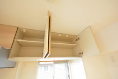 上部には吊戸棚と換気扇。窓があるとはいえオープンキッチンですので、調理中は換気扇をお忘れなく!