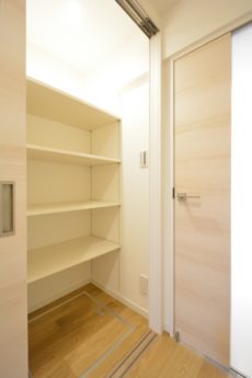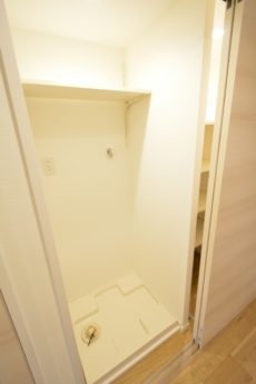 右側は収納棚、左側は洗濯機スペースになっていました。収納棚は奥行きが深く、棚の前に掃除機などの高さのある物も収納可能です。隣が洗濯機ですので湿気には注意ですね。