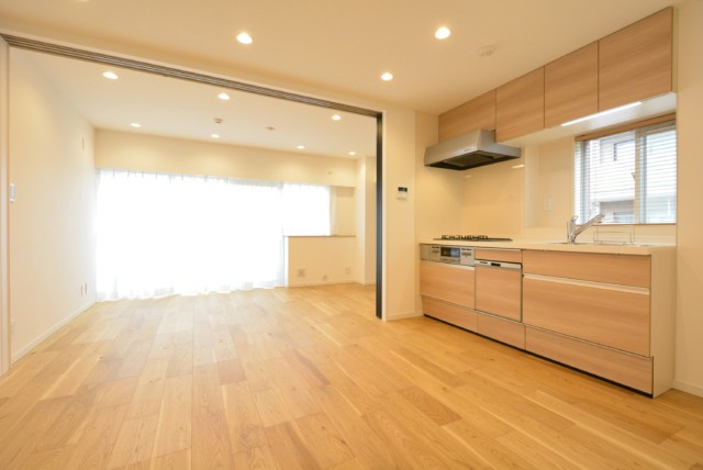 こちらは約7.4帖のダイニングキッチン+約7.3帖の洋室。洋室の仕切り戸を開放して二部屋をつなげた様子です。約14.7のリビング・ダイニング・キッチンの出来上がり♬ ライフスタイルに合わせて使い分けられるのはいいですね。二つの窓で採光、通風共に良好ですよ。