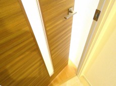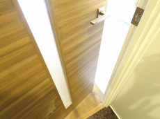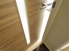 玄関からは左右に廊下が伸びていて、右側にLDKと洋室、左側に洋室二部屋と洗面関係があります。宅配便やフードデリバリーなどで知らない人が訪ねて来る機会が増えている今の時代、戸口から室内の様子が見えづらいのは嬉しいですよね。玄関の照明には人感センサーが付けられているので、暗い中手探りでスイッチを探したりする必要はありません。