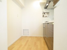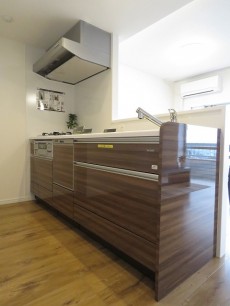 キッチンは独立タイプ。扉こそありませんがかなり奥まった目立たないところにあります。解放感のあるカウンターキッチンもいいですが、寛ぎの場所から生活感が出やすいキッチンを隠すというのも捨てがたいですね。料理に集中できるという理由でお料理好きの方から支持を受けているという話も聞いたことがあります。こちらには冷蔵庫や食器棚のスペースのほかに洗濯機スペースも!もちろんしっかりと扉が付いていますのでご安心ください。調理台は食器洗浄乾燥機付き。