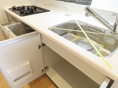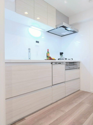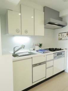 キッチンは清潔感のあるホワイト。浄水機能付き水栓、3口ガスコンロ、食洗機付きとスペック◎です。後は腕をふるうのみ・・・!