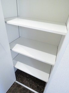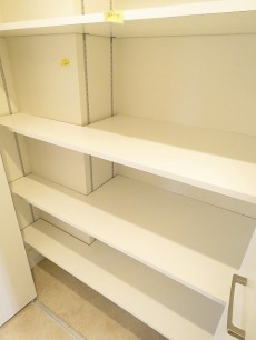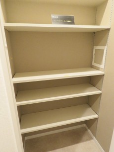 洗面室の向かい側は可動棚付の物入れが設けられています。日用品のストックやリネン類などはここにまとめて入れておくイメージでしょうか。