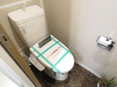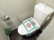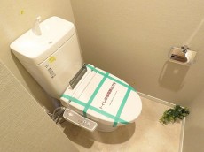 トイレはウォシュレット付き。ペーパーのストックや小物の保管に便利な吊戸棚も設置されています。