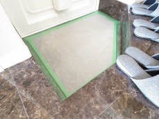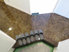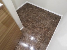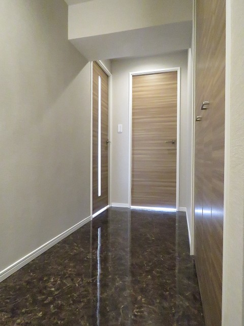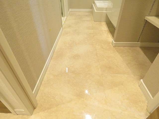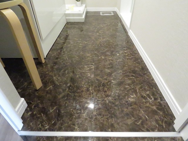 玄関を入ると高級感のある天然石のような柄のツルリとした廊下が左右にのびています。