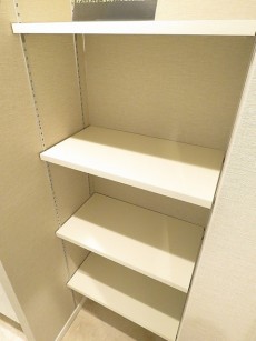 洗面室の向かい側には可動棚付きの収納スペースがつくられています。タオル類やバスマット、シャンプーや洗剤など日用品のストックなどの保管場所にちょうどいい位置です。