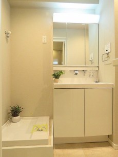 トイレのお隣は洗面室。廊下と同じくツルリとしたタイル貼り。汚れもサッと拭けば簡単にキレイになりそうです。中は洗面化粧台、洗濯機置場、バスルームがまとまっています。