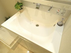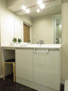 洗面化粧台は使い勝手のよいワイドなカウンター付き。パウダールームみたいでステキですね!ここまで大きな洗面化粧台が設置されているお部屋もなかなかないかと思います。