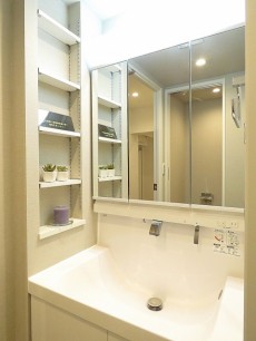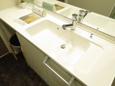 洗面化粧台は鏡の裏、横と小物が収納できるスペースが豊富にあり、ゴチャゴチャ散らかりがちな水廻りもスッキリ片付けておけそうな雰囲気。蛇口はひっぱるとシャワーになるので洗面ボウルのお掃除や花瓶の水入れも楽におこなえます。