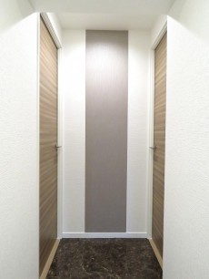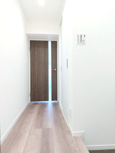 玄関をあがって廊下右方向へ。洗濯機置場とシューズインクローゼット、ウォークインクローゼット、LDK扉がこちら側にあります。