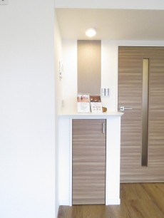 白基調の明るい玄関ホール。玄関扉を開けたすぐ正面は壁なので、外から室内が丸見えになる心配はありません。インターホンは来訪者の顔が確認できるTVモニター付き。毎日の安心安全な暮らしをサポートしてくれます。