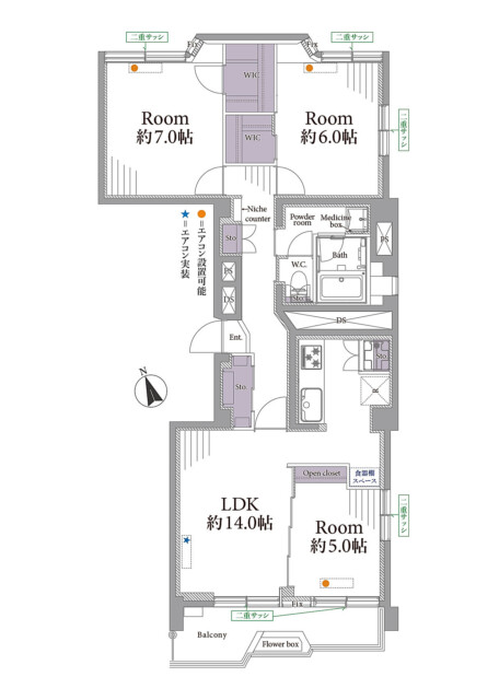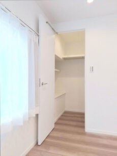 廊下に面した二つの洋室(約6帖・約7帖)は共にウォークインクローゼット付き。L字型にハンガーポールが設置された大きな収納で、衣類以外の嵩張るものを入れたり、衣装ケースなどで収納力をアップさせるのも良さそうです。