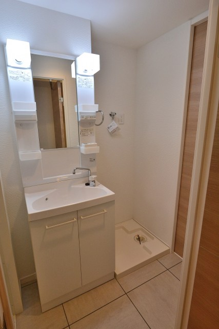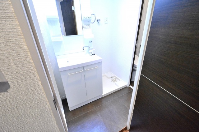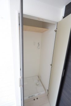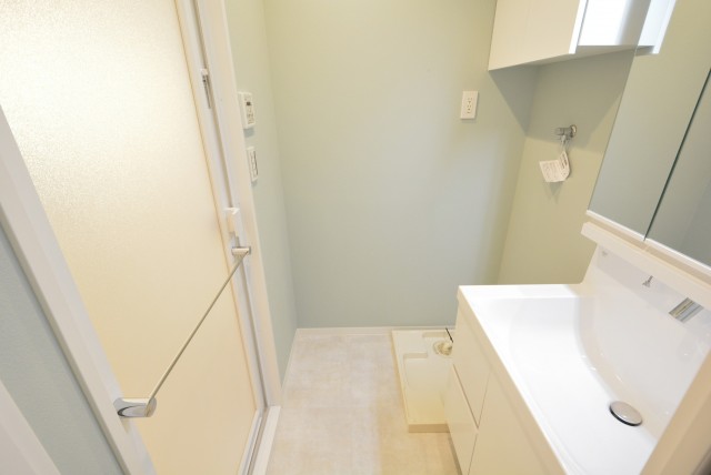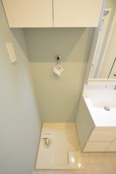 洗面台の隣に洗濯機置場があります。こちらには収納用の棚がないので、上部に棚を取り付けて洗濯機周りもスッキリとお使いください☆