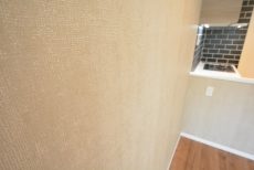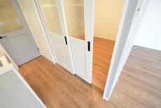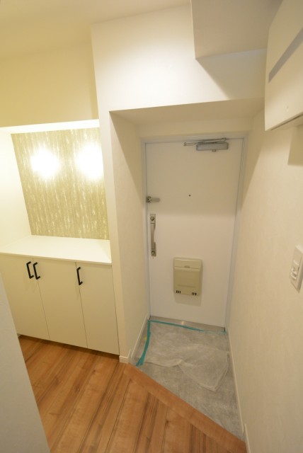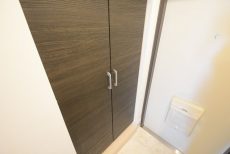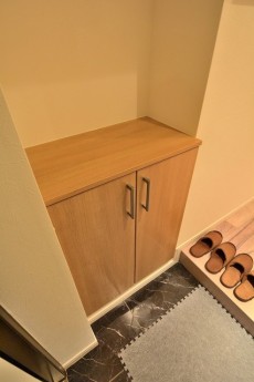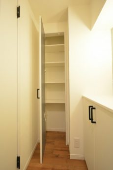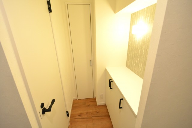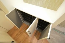 正面には収納棚、右側にはロータイプのシューズボックスがありました。シューズボックスの上はカウンターになっていて、何か飾る事が出来ます。ただ、普通と違って目立たない所なので、実用的に物を置いても良いかもしれませんね。