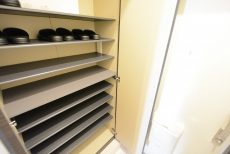 壁にはめ込み式のトールサイズのシューズボックスは、収納たっぷりで丈長のブーツ類も片付きます。