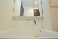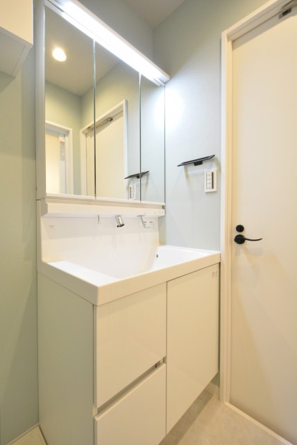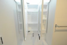 収納スペースの豊富な三面鏡タイプの洗面台です。