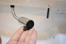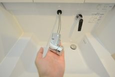 水栓はハンドシャワータイプ。洗面ボウルを流したり、寝ぐせくらいなら直せそうです。