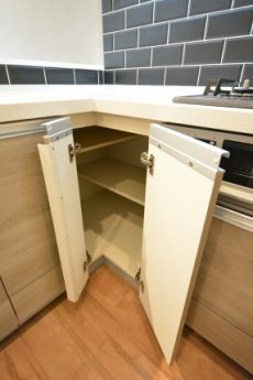 コーナー部分だけは開き戸ですが、扉が大きく開くような工夫がされていました。上部には吊戸棚も付いています。