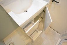 収納は洗面台下と鏡裏のキャビネット。大きな物から細かい物まで上手いこと収まりそうですね。