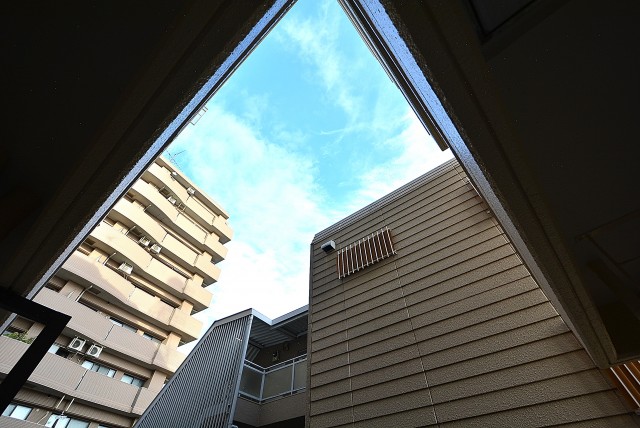 上を見るとこんな感じで建物の間から空が見えます。