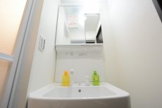 洗面化粧台は洗面ボウル下の収納スペースの他、鏡の裏に小物が仕舞えるようになっています。ゴチャゴチャしたものは鏡の裏側へ仕舞えば見た目もすっきり。