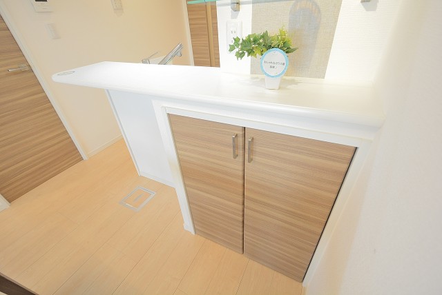シューズボックスの下にはフットライトが設置されていて、玄関の足元を優しく照らしています。ライトといえば人感センサー。中に入っただけで自動的に照明を点けてくれるので、もう暗い中スイッチを探す必要はありません。いつでも明るい玄関が迎えてくれるのも嬉しいですよね。
