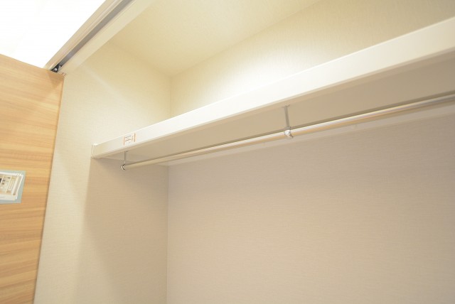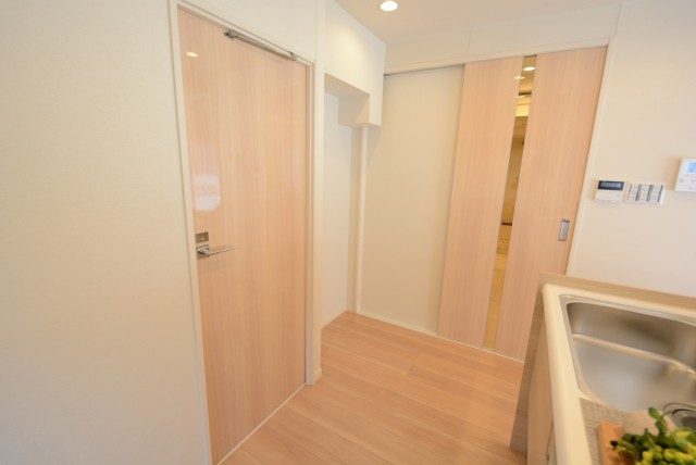 廊下右側のドアはウォークインクローゼット!!間取り図には多目的収納とありましたが見た目はウォークインクローゼットです。もちろんキャリーバッグやスーツケースなど洋服以外の物を入れる事も出来るので、やっぱり多目的ですかね(笑)