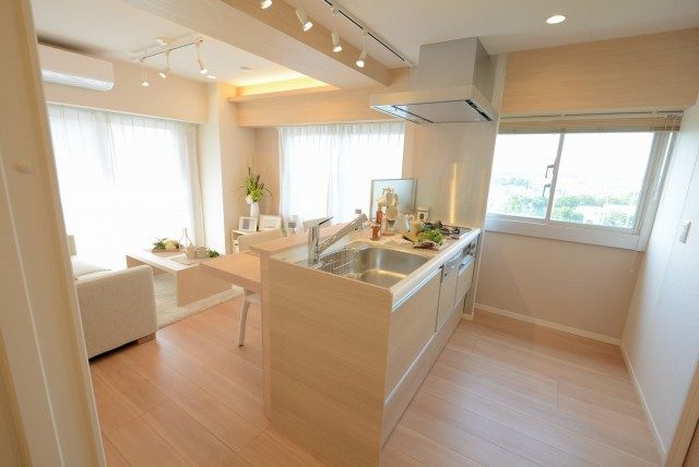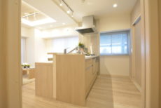 こちらがリビング・ダイニング・キッチン。角部屋ならではの二面採光のお部屋です。床や建具だけでなく、壁や天井、造り付けの家具にまで使われた白木が印象的ですね。