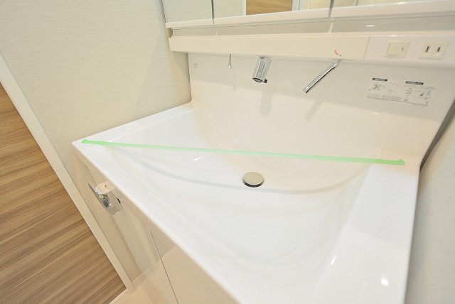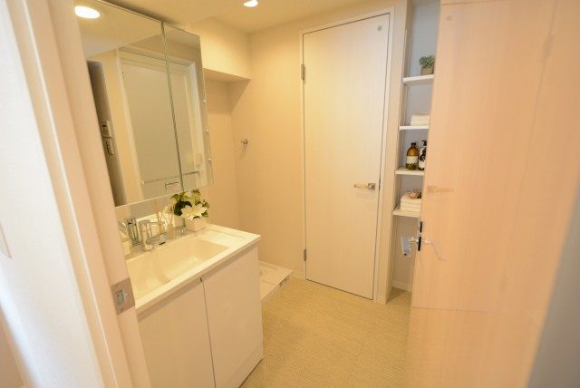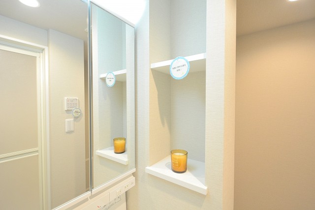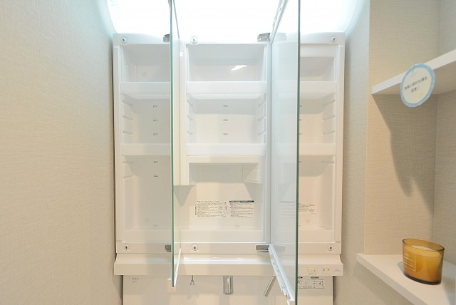 洗面台は三面鏡付き。身だしなみのチェックに役立ちます。