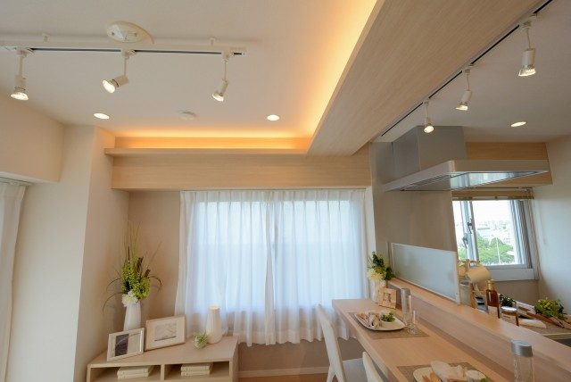 リビングの天井部分には間接照明を使った優しいライティングに加え、アクセントを付けるスポットライトも付いています。ダイニングテーブルはキッチンカウンターと一体化した造り付け。並んで食べるのもアリですよね♪♪