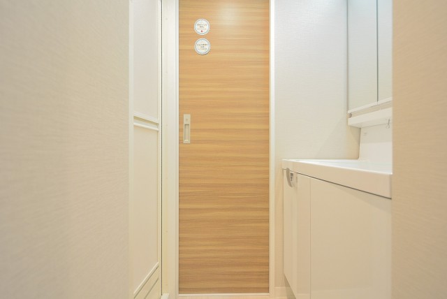 洗面室には洗面台、洗濯機スペース、リネン棚、トイレ、浴室がまとまっています。