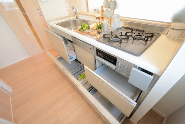 調理台下は引き出しタイプの収納と食器洗浄乾燥機。食洗機があれば、食後の時間をのんびり過ごす事が出来そうです♬