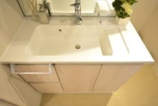 収納は洗面台下と三面鏡裏のキャビネット。細々した物が多くなりがちな洗面周りには、キャビネットは欠かせません。