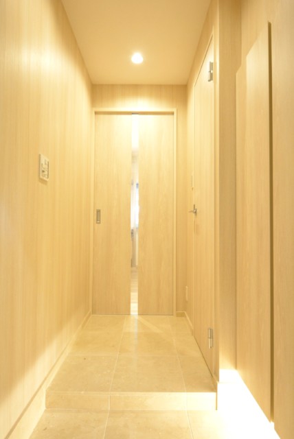 玄関ドアを開けると、玄関から廊下にかけては大理石貼りになっていて高級感いっぱい。床が大理石だと冷たい印象になりがちですが、石の色を暖色系にしたり、壁を白木にしたりで温かみのある雰囲気になっています。