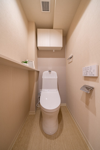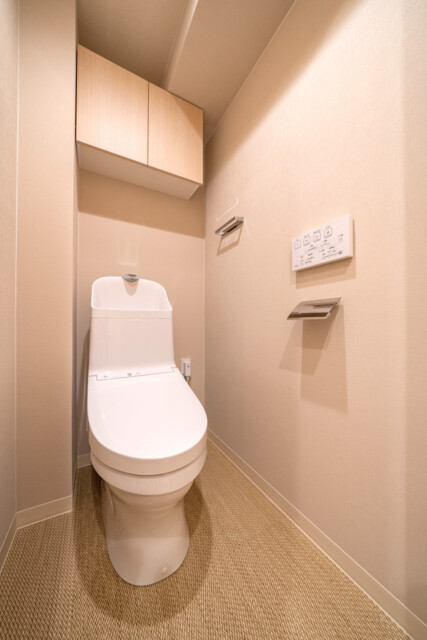 トイレはTOTO製の温水洗浄機能付き。トイレットペーパーや掃除道具を入れるのに便利な吊戸棚も付いています。