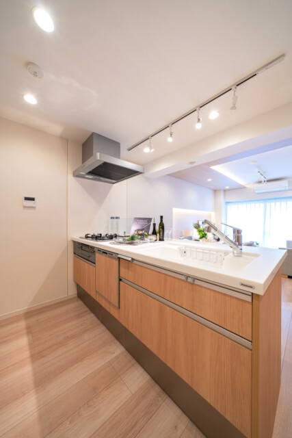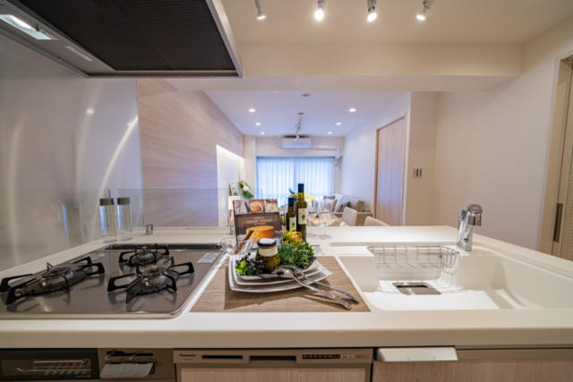 お料理をしながらでもご家族とのコミュニケーションがとりやすいのが人気の理由です。生活感のあるキッチン内が、寛ぎのスペースから目立たないのもいいですよね。食器洗浄乾燥機や浄水機能一体型水栓など、アシスト機能もしっかりと完備されたキッチンです。