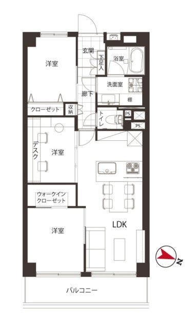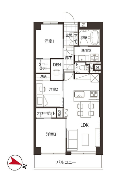 今回ご紹介するお部屋は3階、専有面積61.28㎡の3LDK+DEN。DINKSやファミリーの方にお勧めのお部屋です。在宅ワークに便利なDEN付きなのが嬉しいですね♪
