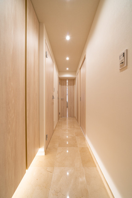 玄関から真っすぐ伸びた廊下には大理石が貼られ高級感いっぱい!全体が柔らかい色合いなのも上品な雰囲気でいいですよね。シューズボックスは収納力のあるトールタイプ。下に空間があるので濡れた靴を目立たずに乾かしておいたりに便利ですよ。照明には人感センサーが付いていて自動的にライトを点けてくれるので、暗い中手探りでスイッチを探したりする必要もありません。いつでも明るい玄関が迎えてくれるのは嬉しいものです。