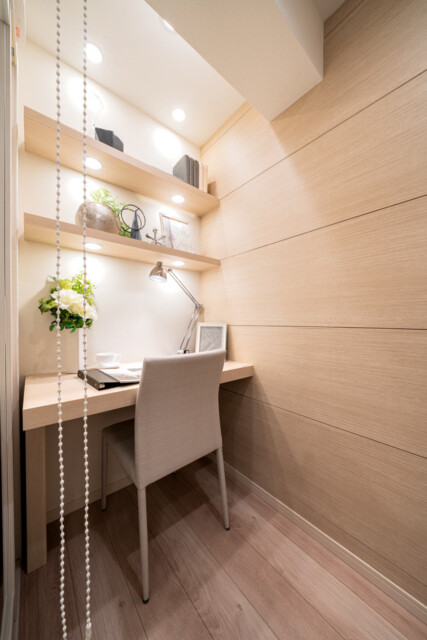 廊下に面したガラス張りのお部屋です。デスクや棚が造り付けになっていて在宅ワークにピッタリ。ロールカーテンが付いているので仕事中は下ろしておくのがおススメです。